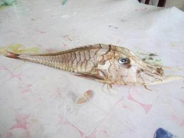 婆罗洲沿岸日前发现了一种奇怪的生物,由于无法辨识,当地将这种生物暂时命名为“盔甲鱼”(Armour Fish)。其嘴巴两侧长着长矛似的牙齿,背部的脊柱高高耸起,上面长满硬刺。当地的渔夫和专家都无法辨识出这只和脚差不多长的生物。根据相貌,可以推断为黄鲂鮄科。 发现过程