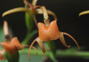 尾唇羊耳蒜为地生草本。假鳞茎较小,外被白色的薄膜质鞘。叶2枚,宽卵形或卵形,膜质或草质,长2-3(-8)厘米,宽2-4厘米,先端钝或近急尖,边缘具明显不规则粗齿,基部圆形并下延成鞘状柄,无关节;鞘状柄长0.5-3厘米。 花葶长6-7厘米(记载可达20厘米以上),明显长于叶;花序柄圆柱形,略扁,有狭翅;总状花序具数朵花;花苞片卵形,长1毫米许;花梗和子房长7-8毫米;花绿色或紫红色;萼片线形或线状披针形,长9-12毫米,宽1.5-2毫米,先端近急尖,具3脉;侧萼片稍斜歪;花瓣丝状,长8-10毫米,宽约0.5毫米;唇瓣近卵状长圆形,长6-7毫米,先端短尾状(尾长约1毫米),约在下部1/3处多少外折,基部有1个褶片状的硕大胼胝[zhī]体;蕊柱长约2毫米,略向前弯,近无翅。 产地生境