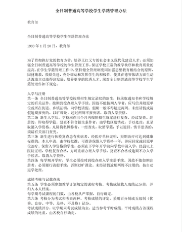 全日制普通高等学校学生学籍管理办法是由教育部于1983年1月20日发布的法规性文件。该管理办法涵盖了入学与注册、成绩考核与记载办法、升级与留、降级、转专业与转学、考勤与纪律等多个方面的具体规定。[1][2]