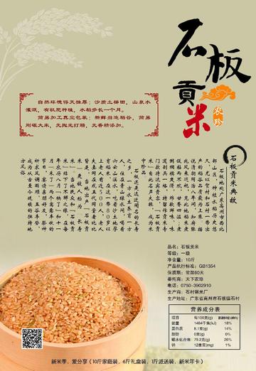 石板地处广东高州市西北部山区,种植水稻历史悠久,尤以贺村和石村一带出产的稻谷品质最为上乘。据说清朝同治八年间,知府张兆凤来巡视,见此地稻米煮饭粘而不腻,甘香四溢;煮粥稠糯爽滑,绵软鲜味,味道别具一格,特留作贡米专门款待达宾贵客,“石板贡米”自此名声大振,成为米中珍品。 石板还是远近闻名的长寿之乡,一方水土养育一方人,住在青山绿水间,喝着六云山溪水,吃着沙土地孕育稻米,在这一带80岁以上老人有近500人,老人夫妻同在或五代同堂者比比皆是,当地出产“石板贡米”更被人称为“长寿米”。当地民众和“石板贡米”结下了不解之缘,在每年农历八月“秧了”和十一月“禾了”两个寓意丰收的节日,宴请亲朋好友,祭神祈求风 调雨顺,五谷丰登,成为从古至今延续的独特地方风俗。 基本介绍