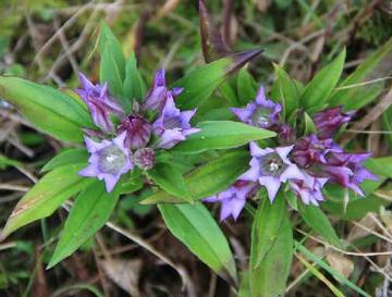 多年生草本,高10-30厘米。须根略肉质。主茎粗壮,发 达,长达10厘米,平卧呈匍匐状,分枝多,较粗而长,斜升;花枝多数,丛生,斜升,紫色 或黄绿色,中空,近圆形,光滑或在上部密被紫红色乳突。叶狭椭圆形、椭圆状披针形至最上部叶为倒披针形,先端渐尖或钝,基部渐狭,边缘微外卷,有乳突或光滑,叶脉1-3条,在两面均明显,并在下面突起;莲座丛叶长3.5-10厘米,宽0.8-2.2厘米,叶柄膜质,长0.7-3厘米;茎生叶多对,长3-7厘米,宽1.2-2.2厘米,叶柄长0.5-1.2厘米,愈向茎上部叶愈大,柄愈短。 花多数,簇生枝端呈头状,偶有腋生,被包被于最上部的苞叶状的叶丛中;无花梗;花萼倒锥形,长1.5-2厘米,萼筒膜质 ,全缘,不开裂,裂片绿色,不整齐,2个大,椭圆状匙形,长7-9毫米,3个小,线状披针形,长5.5-6.5毫米,先端渐尖或钝,基部狭缩成爪,边缘有乳突或光滑,中脉在背面明显,裂片间弯缺截形;花冠蓝色或蓝紫色,冠檐具多数深蓝色斑点,漏斗形或筒状钟形,长2.5-3.5厘米,裂片卵形,长4-5毫米,先端具尾尖,全缘,褶偏斜,三角形,长1-1.5毫米,先端急尖,全缘;雄蕊着生于冠筒下部,整齐,花丝线状钻形,长13-15,毫米,花药矩圆形,长2.5-3毫米;子房线状椭圆形,长10-12毫米,两端渐狭,柄长7-10毫米,花柱线形,连柱头长2-3毫米,柱头2裂,裂片线形,外卷。 蒴果内藏或微外露,椭圆形,长1.2-1.5厘米,两端钝,柄长至1.7厘米;种子黄褐色,有光泽,矩圆形或近圆形,长0.4-0.6毫米,表面具蜂窝状网隙。花果期8-11月。