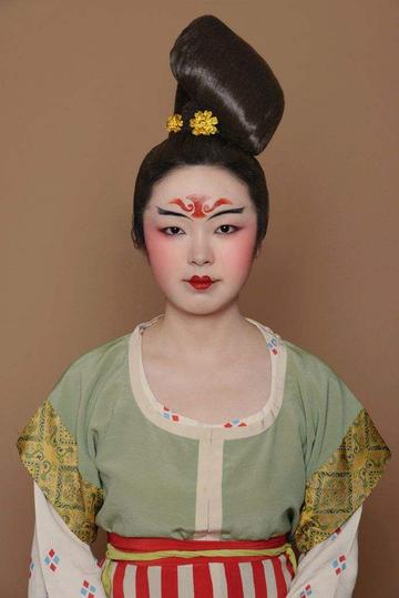 单刀半翻髻[2]的特点是高耸的发髻一侧弯曲呈一定幅度,在顶端位置微微向前向下弯曲,整个发髻的形态宛如一把大刀。这种发式通常使用假发制成,饰以珠宝、花翠等饰品,斜插步摇,最终固定于头顶,展现出高贵而婉约的美感。