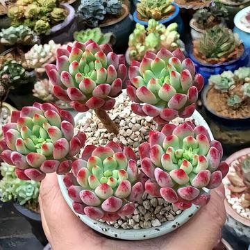 蓝苹 果多肉植株常呈莲座状株型,易从茎的下部长出新枝,形成群生态,渐变成老桩。叶片,匙形,轮生,莲座状排列,肉质饱满,略显扁平,叶背有些凸起,有龙骨线,叶面平,或微微内凹,叶端稍收窄、收尖,叶色较为丰富,随季节、温差的变化而变化,有蓝绿色、紫色、漂亮的果冻色等,叶端有桃红色、粉红色、或是玫瑰红色的色晕,老叶的叶面、叶背有大面积的红晕,出状态时红得更加浓烈、更加令人陶醉,叶面被有白粉。 蓝苹果多肉夏季叶端的红色容易变淡,甚至完全退掉,基本呈蓝绿色状态。花期春季,聚伞花序,花开5瓣,五角星形,柠檬黄色。[2]