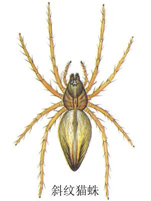斜纹猫蛛雌蛛体长7-9毫米。全体呈黄绿色或黄褐色。雄蛛体长6.30-7.40毫米。分布:湖北、