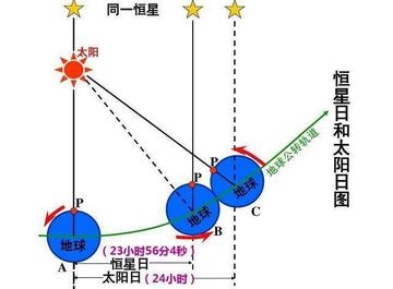 在自转的同时还在绕日公转,一个太阳日,地球要自转360°59'需24小时。分真太阳日(视太阳日)和平太阳日。