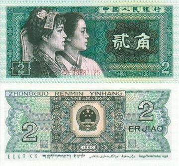 我国先后发行2角面额货币共四种,其中纸币三种(第二、第三、第四套)、硬币一种(第三套),首次出现2角面额纸币是在1955年3月1日发行的第二套人民币中,正面图案为蒸汽火车头,该版本于1999年1月1日停止流通。1962年4月15日,发行第三套人民币2角纸币,正面图案为武汉长江大桥,1980年4月15日又增发了第三套2角面额的硬币,黄铜材质,第三套2角纸币与硬币于2000年7月1日停止流通。1988年5月10日发行第四套2角纸币,于2018年5月1日停止流通。第一套、第五套人民币中均为发行2角面额纸币与硬币。截止2020年,市场上已无2角面额人民币流通。 纸币现状