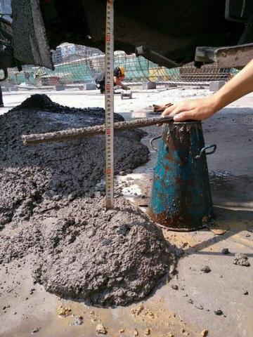 坍落度的测试方法:用一个上口100mm、下口200mm、高300mm喇叭状的坍落度桶,灌入混凝土分三次填装,每次填装后用捣锤沿桶壁均匀由外向内击25下,捣实后,抹平。然后拔起桶,混凝土因自重产生坍落现象,用桶高(300mm)减去坍落后混凝土最高点的高度,称为坍落度。如果差值为10mm,则坍落度为10。