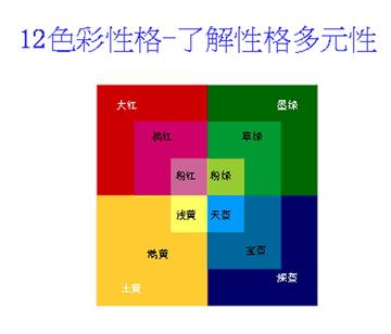 十二色彩性格本色测验采用四种基本色块——红、绿、黄、蓝,作为艺术视觉本能投射的基础。这些图案均为正方形,没有方向性限制,共有九张。受测者被要求根据个人内心感受,直接描述他们看到的形象及其构成颜色。通过对九张图卡的观察和描述,可以得出受测者的性格类型。这一过程基于十字坐标系统的原理,其中红色和绿色被视为相邻色,黄色和蓝色也是相邻色,因为它们在外在表现上有相似之处。然而,在内在心理需求上,红色与黄色以及绿色与蓝色的需求相似,因此在坐标系中分别位于上下位置。西方的研究表明,黄色性格约占46%,红色性格占27%,绿色性格占17%,蓝色性格占10%。而在中国的测试中,红色性格占52%,黄色性格占24%,绿色性格占15%,蓝色性格占9%。此外,每个颜色组别还 细分为不同的亚型,如红色可分为大红色、桃红色、粉红色等。[2]