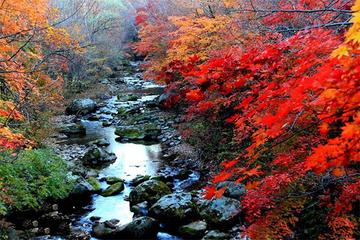 等,谷底河水四季长流。秋时,各种红叶树种相继披红挂彩,浅黄、