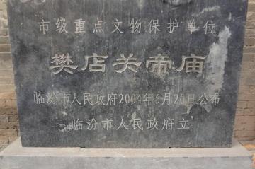 樊店关帝庙位于山西省临汾市翼城县南唐乡樊店村,占地1642平方米。庙内中轴线上依次为戏台、献殿、大殿,轴线两侧为东西庙门、东西耳楼、廊房、配殿、耳殿。 现存大殿为元代风格,戏台、东西庙门仍保留有明代风格,东西耳楼为清代建筑。大殿面阔三间,进深四椽[chuán],单檐悬山顶,五檩[lǐn]无廊式,前檐下三踩单昂斗拱七攒,后檐下三踩单昂斗拱四攒;东西庙门均为面阔一间,进深二椽,硬山顶,东门额题“允文允武”,西门额题“亦神亦圣”;东西耳楼均为面阔三间,进深二椽,硬山顶。 樊店关帝庙于2004年5月20日公布为:临汾市级重点保护文物古迹。 基本介绍