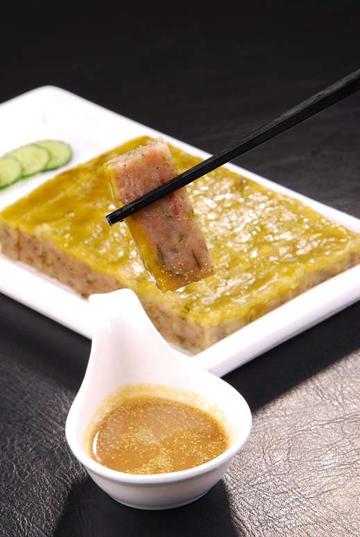 上,四面裹好,上笼蒸熟,等到冷却凝固成长方形的块状,再改刀切成或条或片的形状拼盘,上桌就是一种特色凉菜;沾上