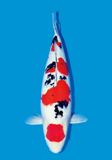 同为锦鲤的代表品种。其主要特点是:在鱼体雪白的底色上,又浮现绯红、乌黑两色斑纹;斑纹呈现出优美自然的图案,头部只有红斑而无黑斑,胸鳍上有黑色条纹者为基本条件。