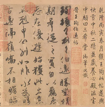 《伯远帖》是东晋书法家王珣所书写的一封信札,纸本,行书,5行共47字,纵25.1厘米,横17.2厘米,现收藏于北京故宫博物院。[1][3][2] 《伯远帖》是作者给亲友伯远书写的一通信札,为行书早期的典范之作,表达了王珣对亲友病况的担忧以及天各一方的惆怅。[4]该帖用笔精熟,疏朗飘逸。起笔多顺露直入,行笔中端多按笔,收笔则提按结合,转折处大多方正刚劲,停顿自然。笔画中还较多地保存了楷书笔意和隶书韵味。[5]结字扁方为主,纵扁、大小、正斜相兼,在依其本字之形的基础上,随情随势而极尽变化之能事。或纵或扁,或正或斜,或密或疏,或收或放,形成不同的姿态。[5]章法布局灵动。[6]