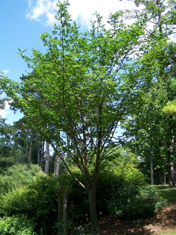 苦木(拉丁学名:Picrasma quassioides),是苦木科苦木属的落叶乔木,以苦味著称,故有苦树、苦胆树之名。[2][1]该树种分布于中国陕西、山西、河北、河南等省份,亦见于印度北部、不丹、尼泊尔、朝鲜和日本,[2][4]多生于海拔1400-3200米的山地杂木林中。[2] 苦木树皮紫褐色,平滑。叶为奇数羽状复叶,托叶披针形,早落。花为雌雄异株,复聚伞花序腋生,花瓣与萼片同数;雄花中雄蕊长为花瓣的2倍,与萼片对生;雌花中雄蕊短于花瓣。果为核果,成熟时呈蓝绿色。花期4-5月,果期6-9月。[9][5]苦木为中性偏阳树种,喜光,喜湿润、肥沃的土壤,[5][4]繁殖方式以播种为主。[5] 2023年,苦木的两个变种苦树(原变种)和光序苦树均被《中国生物多样性红色名录—高等植物卷(2020)》评估为无危(LC)。[10][11]苦木味苦,性寒,有小毒,具清热解毒、祛湿的功效,可用于风热感冒、咽喉肿痛、湿热泻痢,以及湿疹、疮疖、蛇虫咬伤等症。[12][6]其木材适合制作家具、农具、器具等;茎皮纤维可制作人造棉、生产高级文化用纸,树皮可提取染料、制作农药,枝、叶煎汁还能清除农业害虫。[5][13]苦木秋叶红黄相间,园林中可作为风景树。[8] 植物学史