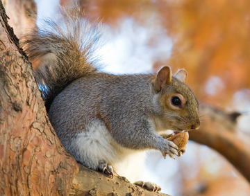 灰松鼠(拉丁学名:Sciurus carolinensis),又名东部灰松鼠,是松鼠科松鼠属的一种树栖型松鼠。[2][3]其原产于美国东部,后被引入美国西部各州、加拿大、英国、意大 利和爱尔兰等,偏好栖息在林下植被丰富的成熟连片林地。[2] 灰松鼠是中型松鼠,体型和体色无雌雄二态性。体重338-750克,体长380-525毫米,尾长150-250毫米,成年个体共有22颗牙齿。背部毛色从斑驳深灰色到浅灰色不等,可能带有肉桂色调;耳朵呈浅灰色至白色,尾巴为白色至浅灰色,腹部为灰色至棕黄色。黑化个体在分布区北部较为常见,白化个体在所有区域均罕见。灰松鼠是杂食性动物,以植物的果实、种子为主食,兼食昆虫、鸟卵、草本植物和真菌等。雌性怀孕后单独筑巢,哺乳期雌性攻击性强,其他个体会主动回避。[2] 灰松鼠妊娠期约45天,幼崽主要在春季和夏季出生,平均窝仔数为3只。[5]野生灰松鼠的最长寿命为12.5年,圈养个体平均寿命23.5年。[2] 灰 松鼠引种进入欧洲的英国和意大利后,竞争排斥本地物种红松鼠,被世界自然保护联盟(IUCN)列为世界危害严重的100种入侵物种之一。[3]2018年,灰松鼠被《世界自然保护联盟(IUCN)濒危物种红色名录》评估为无危(LC)物种。[2][4]