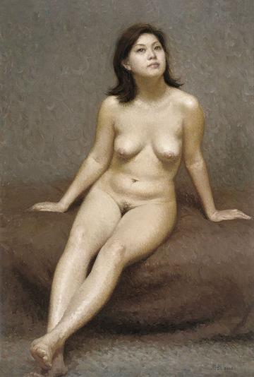 《仰视的女人体》的尺寸是90×60cm,右下角有钤印“尚谊.2002”。画作描绘的是一个坐着的裸体的女人:她体态丰盈,双脚微微交叉,身体微倾,双手分开放在坐着的物体上,头部微微抬起向上看。[1][2]