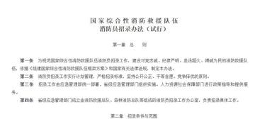 《国家综合性消防救援队伍消防员招录办法(试行)》旨在规范国家综合性消防救援队伍消防员招录工作和建设对党忠诚、纪律严明、赴汤蹈火、竭诚为民的消防救援队伍。《办法》由人力资源社会保障部、应急管理部于2018年12月23日印发,共五章十九条,自颁布之日起施行。