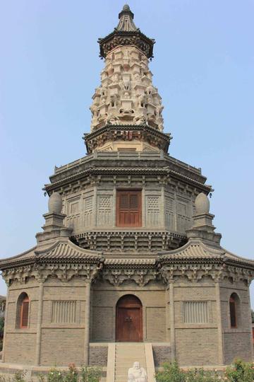 广惠寺华塔又称多宝塔,位于中国河北省正定县正定镇生民街路东。因塔身第三层以上八面八角的垂线有龙虎豹狮象及佛像等壁塑,形如花束,被称为华塔。[1]华塔是中国古塔中的一种特有类型。[2]广惠寺华塔是中国保存年代最早且较完整的华塔,为中国重点文物保护单位。[3] 广惠寺华塔建于唐贞元年间(785一805年),金大定年间(1161一1189年)重修;[3]1961年被列为中国重点文物保护单位;[4]1995年4月-1999年9月,主塔进行了重新整修,并恢复了四隅小塔。[5] 广惠寺华塔由主塔和附属小塔构成,全用砖砌。主塔底层四隅各附建一六角形亭状小塔,小塔环抱主塔,主次相依。主塔是一座楼阁式建筑,通高31.5米,共分四层,各层檐下均配置砖仿木构斗拱。[6]一至三层平面作八角形,底层中部砖制斗拱,北侧辟一券门。第四层平面略呈圆形,外观如同一圆锥体,其高度约占全塔通高的三分之一。圆锥体内檐塔室供奉两尊石佛,外檐以八面八角垂线为中心,交错彩塑菩萨、力士、禽兽、狮、象以及楼台亭阁等形象。第四层上端以砖刻制斗拱、椽[chuán]、枋等,上覆八角亭式塔檐,再上则冠以八角攒尖形塔刹。[4] 建设背景