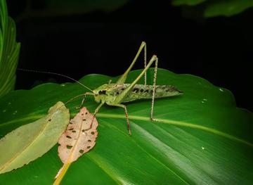 纺织娘(学名:Mecopoda elongata),[1]又叫筒管娘、络纬螽[zhōng]、络丝娘等,[2][3]是露螽科织娘属的一种中型螽斯,[2][1]因其雄虫的鸣声好似纺纱织布声,故名“纺织娘”。[12]纺织娘分布于朝鲜、韩国、印度、印尼、泰国、缅甸、中国、巴布亚新几内亚等地,在中国的东南部沿海各省如浙江、江苏、山东、福建、广东、广西分布最多。[2]纺织娘的成虫在夏、秋季间出现;[5]为夜行性昆虫,白天常常静伏在瓜藤枝叶或溢丛下部,黄昏和夜晚爬行至上部枝叶活动和摄食,[5]鸣叫。[7]它们是一种植食性昆虫,喜欢吃南瓜、丝瓜的花瓣,也吃桑叶、柿树叶、核桃树叶、杨树叶等,但也偶尔食用其他昆虫,是一种农业害虫。[2] 纺织娘体型较大,体长约50-70毫米,体色有绿色和褐色两种,其体形很像一个侧扁的豆荚。[5][6]雌虫体型稍大,头短而圆阔;前胸背侧片基部多为黑色;触角细长线状,超出翅之末端;[5]前后翅均发达,翅长一般为腹部长度的两倍,翅面常有纵向排列的黑色圆纹;[7]后足发达,[5]善于跳跃,能靠跳跃和展开翅膀飞行来躲避天敌,[2]受惊扰时,胸腺中还会分泌黄色毒液,有一定的危害性,能对捕食者起到威慑的作用。[13]