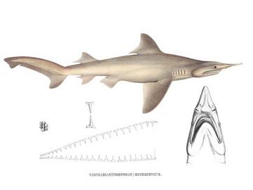 幼鲨出生时长40-60厘米,最大长到168厘米。体纺锤形,躯干粗大,向头、尾渐细小。头宽扁,自胸鳍上方至吻端弧形剧斜,头长约为全长的1/4强。尾稍侧扁,比头和躯干稍短,尾基上方具一浅的凹洼,下方凹洼不明显。吻宽扁,背视三角形,向前窄小,前缘钝尖;侧视尖突。眼很小,圆形,瞬膜发达,距吻端比距第一鳃孔为近,眼径约等于第三鳃孔宽的1/3,等于鼻孔长的2/3。鼻孔宽大,较横平,外侧位,距口端比距吻端为近;鼻间隔较窄,比鼻孔长约大2.3倍,前鼻瓣后部具一较大三角形突出,后鼻瓣不分化。口宽而圆弧形,口宽比口前吻长为大,口长约等于口宽的1/2强,下颌较短,口闭时齿暴露;唇褶很短,上唇褶较粗,下唇褶较细,都从口隅稍向前延。上颌齿侧扁三角形,齿头尖直,边缘具细锯齿,1行在使用,正中1齿很细小,每侧14齿;下颌齿细长,矛状,边缘光滑,2行在使用,正中1小齿,每侧14齿。喷水孔消失。鳃孔5个,颇宽大,中间3个较宽,最后2个位于胸鳍基底上方。 背鳍2个;第一背鳍颇小,呈三角形,前缘直而低斜,与背面只成30°,后缘几斜直,上角钝圆,下角尖突。起点对着胸鳍基底后方,比胸鳍里角稍前;第二背鳍比第一背鳍稍小,前缘斜直,但斜度较小,与背面成40°,后缘凹入,上角钝圆,下角延长尖突。尾鳍颇宽长,约与头长相等,尾椎轴上翘;上叶只见于尾端近处,下叶前部显著三角形突出,中部低平后延,中部与后部间有一缺刻,后部小三角形突出,与上叶连接,尾端钝圆,后缘凹入。臀鳍比第二背鳍稍小,起点与第二背鳍起点相对,后缘凹入,外角钝圆,里角延长尖突。腹鳍与第二背鳍约同大,有些方形,边缘几直行,外角和里角钝圆。胸鳍很宽大,三角形,后缘几平直,外角钝圆,里角圆形,鳍端伸达第一背鳍基底中部。 背面和侧面灰褐色,漫布着暗色云纹斑纹及白色小斑;腹面淡白色,或多或少也具暗色斑块;各鳍灰褐色,臀鳍、腹鳍、胸鳍隐约具白色小斑。