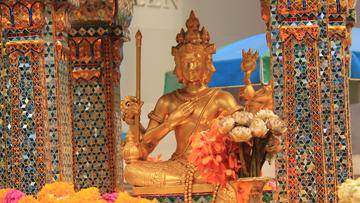 四面佛(Erawan Shrine)是泰国曼谷的宗教场所,位于泰国曼谷爱侣湾酒店边的马路转角处。[3][1] 在东南亚,特别是泰国被认为是法力无边,掌握人间荣华富贵之神;其四面分别朝向东南西北,供信众祈福。由于外形近似中国佛像,中文译名多为四面佛,但事实上四 面佛不是佛,所以准确而言应译为四面神。[4]1951年爱侣湾酒店开始建设,但是经常发生事故,酒店因此请了四面佛来坐镇。1956年,爱侣湾酒店顺利建成,开业后,酒店又将四面佛像安置在门前神坛上。[2]四面佛被供奉在高约4米、工艺精细的花岗岩神龛[kān]内,正襟危坐,全身金碧辉煌,它前后左右有四副面孔,分别代表不同的祈愿:正面求生意兴隆,左面求姻缘美满,右面求身体平安,后面求招财进宝。[3] 四面佛在泰国人心目中的地位极高,每年有很多佛教徒及印度教徒到此膜拜。[3] 历史沿革