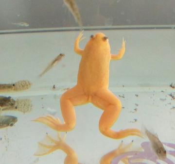 金蛙又称白化非洲爪蟾,是非洲爪蟾(拉丁学名:Xenopus laevis)的白化品系,[1]属于无尾目、负子蟾科、爪蟾属,分布于非洲东南部。[3] 金蛙成体体长6-13厘米,雌性较雄性略大。身体扁平,呈流线型。眼睛小而朝上,虹膜红色,无眼睑及舌。鼓膜不明显,前腿较小,有细且很长的指。后腿粗而强壮,内侧3个趾的前端有黑色的角质爪。幼体和变态后的成体都营水生生活,只善于游泳而不善于陆地跳跃生活。[1] 金蛙是一种用途广泛且容易人工饲养的实验动物,同时,它也是水族箱中的重要宠物,深受饲养者的欢迎;此外,一些人也会把其他种类的爪蟾叫做金蛙,当做宠物饲养。[1]