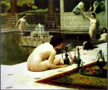 的习俗,周围建筑体现了阿拉伯风格。圆柱、细密的图案、喷泉等与洗浴的女子、波斯花纹的地毯,共同构成了阿拉伯情调,表现了"