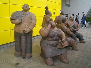 出口,由六个在吃饭、读书和购物的雕像组成。