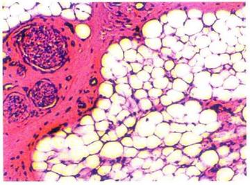 脂肪组织(英文名:adipose tissue),是含有大量脂肪细胞的结缔组织。[6]其以脂肪细胞为主要成分,聚集成团的脂肪细胞被疏松结缔组织分隔成小叶。[2][3]脂肪组织由胚胎时期的间充质演化而成,它是代谢活跃、功能复杂的内分泌器官。[3] 根据脂肪所在的分布区域可以将脂肪组织分为皮下脂肪和内脏脂肪。位于浅表的是皮下脂肪,位于深层的是内脏脂肪。[7]根据脂肪细胞的结构和功能不同,脂肪组织可分为黄(白)色脂肪组织和棕色脂肪组织。黄(白)色脂肪组织的脂肪细胞是单泡脂肪细胞;棕色脂肪组织的脂肪细胞是多泡脂肪细胞。[4]成年人的大多数脂肪组织属于黄(白)色脂肪组织,主要分布于皮下组织、网膜、肠系膜和黄骨髓等处。[3]棕色脂肪组织在新生儿中较多,新生儿主要分布在肩胛间区、腋窝及颈后部等处;成年人含量极少,在肾周围呈岛状分布。[2][3]脂肪组织具有储存和提供能量、内分泌调节、抗寒和维持体温、缓冲保护、支持填充等功能。[3][4][5]
