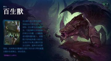 百生兽本身不带有武器,但能在自己身上生成一支部队。百生兽从感染巢而生,它能够孵化名为蝗虫的寄生共生体,以强酸唾液攻击周遭的敌人。这个爬行怪物能够遁入地表来生成似乎永无止尽的凶猛生化怪物,通常作为防御措施。此时无法活动让百生兽不利於对付带有范围攻击的快速单位,例如恶狼。 角色简介