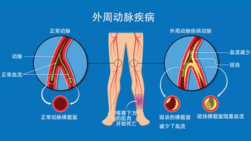 动脉帮助输送富含氧和各种营养物质的血液到身体的各部位。当下肢动脉阻塞后,就无法获得足够的血液或氧气,这时称其为周围动脉疾病(PAD)。 PAD常引起行走时的不适或疼痛,可发生在下肢的各个部位。发病率与年龄成正比。吸烟和糖尿病大大增加危险性。是老年人常见的一种动脉疾病,在血管壁上形成脂质斑块而使血管壁变得僵硬。斑块主要由胆固醇、钙和纤维组织构成。动脉管腔变得狭窄甚至完全闭塞,血流减少,下肢就缺少足够的氧维持正常代谢。可不表现有明显的症状或者出现类似心脑血管疾病的表现,但需治疗,易诱发心脏病及脑卒中。 病因