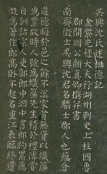 南齐征士吴兴沈君,名士,郡人也。蕴道德,晦于邑之馀不溪。家贫无资,以织帘为业,故时人号为织帘先生。精于《礼传》,尝自诂[gǔ]训。宗人吏部郎中渊、中书郎约累荐,征为著作郎,高卧不起,名重江表。临终遗教,依皇甫元晏棺中贮《孝经》一卷,穿圹[kuàng]三尺,置棺平土,不设机位,四时地席,元酒而奠。子彝,奉而行之。吴郡陆惠晓、张融皆为之诔[lěi]。征士尝制《述祖德碑》,立于金鹅山之先茔[yíng]。年月淹远,风雨蠹[dù]蚀,朽字残文,翳[yì]而莫分。乾元中,为盗火所焚,碑首毁裂,嵚[qīn]然将堕。过江二十叶孙御史中丞震,移牒郡国,请其封葺[qì]。或属兵凶,旷而莫修。忽有仆树,生于龟腹,盘根抱趾,耸干夹碑。岩如工造,郁若神化,欹者复正,危而再坚。夫德无名,遇贤而锺[zhōng]庆;神无质,假物以申应。沈氏积善既远,征士植德既深,天将兴旧族乎?吾 知沈之复大也。权检校宗事十九叶孙前太庙斋郎怡,拜泣松槚[jiǎ],增修旧茔,感先碑之陨覆,惧遗文之残阙,乃具他石,传而贰焉。崇其本,所以尊先也;建其新,所以嗣德也。以真卿江南婚姻之旧,中外伯仲之穆,谬忝[tiǎn]拜刺,见托斯文,刊诸碑阴,以傅无朽。因改其树为庆树,以旌其美焉。沈氏之故事,具于家谍,今阙而不纪。时有唐大历八年冬十二月。 作者简介