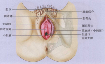 前庭球是男性尿道海绵体的同源体,由具有勃起性的静脉丛构成。[4]其为一对,长约3.0cm,[3]呈蹄铁形,[5]分为较细小的中间部和较大的外侧部。中间部在尿道外口和阴蒂体之间的皮下。外侧部较大,前端细小,后端钝圆,位于大阴唇的皮下。[1]