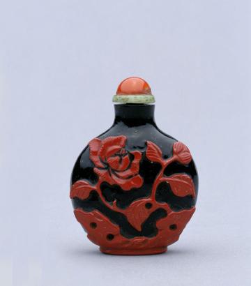 清中期黑套豇豆红玻璃茶花纹鼻烟壶是清中期的鼻烟壶。