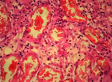 肉芽组织(granulation tissue)是指由新生薄壁的毛细血管和成纤维细胞构成的幼稚结缔组织,并伴有炎性细胞浸润,其在肉眼观常呈鲜红色、颗粒状,质地柔软湿润,似鲜嫩肉芽。[2]镜下观,可见大量由内皮细胞增生形成的实性细胞索及扩张的毛细血管,生长方向与创面垂直,并以小动脉为轴心,在周围形成祥状弯曲的毛细血管网。[1][3]