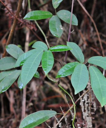 木质藤本,全体无毛;枝与小枝圆柱形,干时褐色或近黑色,具线纹。掌状复叶有小叶3-6片;叶柄长3-8厘米;小叶革质,倒卵形、倒披针形或椭圆形,长5-7厘米,宽3.5-5厘米,先端圆而具凸头,顶具小硬尖,基部狭圆或楔形,边缘加厚,上 面淡绿色,下面粉绿色;基出脉3条,侧脉每边5-6条,近平展,与网脉同于小叶两 面清晰凸起;小叶柄长1-2厘米。花浅黄色,雌雄同株,数朵组成疏花的伞房式总状 花序;花序长约10厘米,3-4个簇生于叶腋;总花梗纤细;小苞片线状披针形,早落;花梗纤细,长2.5-4.5厘米。雄花:外轮萼片卵状披针形,长约8毫米,宽约3毫米,内轮萼片狭线形,长约6毫米,宽约1毫米;花瓣缺;花药彼此分离,长约1.5毫米,顶具长约2毫米的角状附属体,花丝长1.5-2毫米,上部分离,下部合生为短的花丝管,退化心皮锥尖,长约1.5毫米。雌花:外轮萼片长圆状披针形,长约11毫米,宽约4.5毫米,内轮的狭披针形,宽约2毫米;心皮近披针形,长约5毫米,退化雄蕊棒状,长约1毫米。果未见。花期8-11月。 生长环境