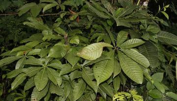 梧桐科苹婆属乔木植物,小枝粗壮。叶为掌状复叶,有小叶7-9片;小叶倒卵状披针形或长椭圆形,长9-23厘米,宽4-6厘米,顶端渐尖,基部楔形,上面几无毛,下面密被星状短柔毛,侧脉22-40对,互相平行;叶柄通常长20-23厘米;托叶三角状披针形,长5毫米,被毛。 花序集生于小枝顶端,为总状花序或圆锥花序,长达2.0厘米;小苞片条状披针形,长约1厘米;花萼白色,钟形,5裂,长约6毫米,外面密被星状短柔毛,裂片三角形,顶端渐尖并互相粘合,与钟状萼筒等长;雄花的雌雄蕊柄线状,无毛,花药10-20个集生成头状;雌花的子房圆球形,5室,密被短茸毛,花柱很短,柱头5裂,不育的花药位于子房下部,围绕着雌蕊。
