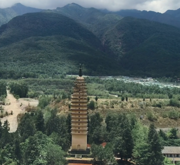 弘圣寺塔位于大理中和镇弘圣寺旧址,寺毁于明初。塔通高43.87米,16级方形密檐式空心砖塔,塔身下部为块石砌成。全塔分为基座、塔身、塔刹3部分,塔身各层之间用砖砌出叠涩檐,其上逐层收分。