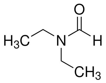 N,N-二乙基甲酰胺(英文名:N,N-Diethylformamide),缩写为DEF,[1]化学式为C5H11NO,[2]为无色透明的液体,具有与N,N-二甲基甲酰胺(DMF)相似的物化性质。[1] N,N-二乙基甲酰胺由氮(N)原子与两个乙基(CH2-CH3)相连,并通过单键与甲酰基(CHO)相连。[2]它是一种极性有机溶剂,可与水,醇,醚,酯及芳香化合物等混溶,且溶解性很强。N,N-二乙基甲酰胺的熔点与沸点均为176-177℃,其密度在25℃下为0.908g/mL。[1] N,N-二乙基甲酰胺在工业上常用作溶剂、萃取剂,是合成品体的优良溶剂,金属有机骨架材料的合成溶剂,新型吸收制冷工质对(R22-DEF)的溶剂,高效锂离子电池的溶剂等,由于毒副作用远小于DMF,DEF常可取代N,N-二甲基甲酰胺(DMF);以及有机合成过程中可作为中间体,如在药物富马酸替硫福韦合成时作基团保护试剂等。另外,DEF在纤维合成领域、医药合成领域也具有潜在的应用价值。[1] N,N-二乙基甲酰胺是易燃物和刺激物,[2]容易造成皮肤刺激和严重眼刺激,并可引起呼吸道刺激。[3] 化学结构