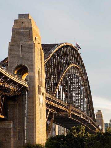 海港大桥(别名:悉尼海港大桥、[2]悉尼港湾大桥、[3]衣服架,[4]英文名:Sydney Harbour Bridge、[1]The Coathanger),[2]位于澳大利亚悉尼的杰克逊海港,是悉尼早期的代表建筑之一。[4]它是一座横跨悉尼港的钢拱桥,连接悉尼的中央商务区和北岸,供公路、铁路交通及行人通行。[6] 1815年,英国建筑师弗朗西斯·格林纳威(Francis Greenaway)提出了建造桥梁的建议。[6]1923年7月28日,海港大桥正式动工。[5]1932年3月19日,海港大桥正式通车。[6][4]自1998年起,海港大桥成为世界上唯一允许游客参与攀登活动的大桥。[7]海港大桥全长约1149米,桥面宽约49米[b],[6][4]拱门跨度503米,顶部高出海平面134米。[1] 海港大桥于1999年6月25日被列入新南威尔士州遗产名录,2007年3月19日被列入澳大利亚国家遗产名录。[2] 历史沿革