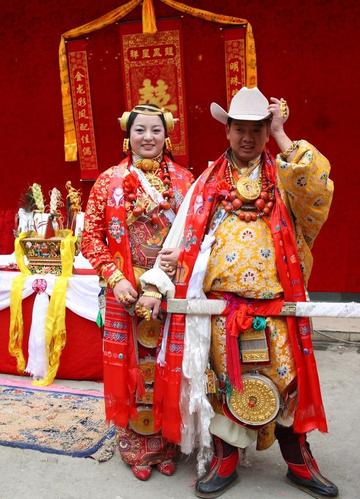 早在远古时代,藏族先民就按一定的婚姻规则组建家庭,聚族而居,并形成了一套相关的礼仪习俗。吐蕃时期,藏族的婚姻仪礼便已基本定型。一部名叫《择偶七善业仪轨》的本教礼仪文献,详细描述了藏族古代婚姻的过程和各种仪式,有八个方面的内容:请神灵来至新娘身边驱魔,洗去污秽不祥,为新娘铺设地毯迎进家门,献给新娘三种奶制品,为新娘取一新名,祈求众神保护,招福,颂祝吉祥。其中,在洋洋洒洒的新婚庆典的祝辞中,还提到新郎的灵魂金,新娘的灵魂玉;新郎的登天绳,新娘的吉祥绳;新郎的生命箭,新娘的金纺锤,祝祷它们的结合永不分离,将新郎、新娘托付给神,祈祷神灵保护新人的婚姻和生命。从《择偶七善业仪轨》可知当时婚俗之丰富、礼仪之繁缚、内涵之深厚。藏族古代的这一婚仪特点,在今天藏族婚俗文化中还较多地保存着。藏族的婚恋礼俗,从择亲选偶、订亲迎娶到婚后习俗都具有鲜明的民族与地域特点,同时,又带着厚重的时代印迹,呈现出传统与现代交织混融、多姿多彩的风貌。[5]