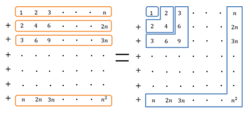 把立方数摆成一种“馨折形”的数。他先在正方形格子里放上石子,放的方法是最上面一行和最左边一列都按1、2、3、……来放石子。其他空格中的石子数,等于对应的最上面一行和最左边一列两格石子数的积。然后把正方形格分割成若干个拐角形,这种拐角形就叫“馨折形”。