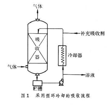 气液两相的温度在过程中发生显著变化的吸收操作。如果被处理的气体混合物中含有可被吸收的溶质量较大,而且溶质组分溶于吸收剂时的溶解热(物理吸收时)或与吸收剂之间的反应热(化学吸收时)较大,则吸收过程中释放出来的热量远大于设备散热量和少量吸收剂汽化所消耗的热量。两相的温度会随吸收的进行发生明显的变化,吸收剂的出口温度会比进口温度高得多,在吸收设备中也会有不相同的温度分布。温度升高将影响气液平衡(见汽液平衡)关系,使传质推动力明显减小,同时传质系数也随温度而有所变化。通常温度升高使气相传质分系数减小,使液相传质分系数和反应速度(在化学吸收中)增大。对于高溶解度溶质的吸收,气阻控制传质,温度升高时对吸收很不利;对于低溶解度溶质的吸收,液阻控制传质,适当的升温能达到较高的传质总系数,但温度太高时,因为传质推动力下降太多,对吸收仍然不利。为此,对非等温吸收来说,一般须采用适当的冷却措施,以维持适当的操作温度,保证吸收产物的质量。从吸收设备中移去热量的方法有: ①循环冷却 (图1)。将部分出塔液体经塔外冷却后送回塔顶,以增加塔内液体流量,减少温升,多用于填充塔。