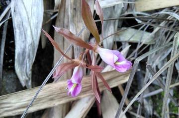 总状花序具2(-3)朵花;花苞片披针形,短小,先端渐尖,较子房和花梗短;子房椭圆形,具棱,无毛,长5-7毫米,具长约5毫米、向下弯曲的细花梗;花多少下垂,半张开;萼片和花瓣棕黄色或淡红色,具紫红色脉,近等大,线状长圆形,长20-25毫米,宽2.5-3毫米,先端渐尖;唇瓣带白色或淡红色,具紫红色脉,凹陷,摊平后为近菱状长椭圆形,长18-20毫米,宽10-12毫米,内面无毛,近中部不明显的3浅裂;侧裂片小,先端钝圆或钝,直立,围抱蕊柱;中裂片明显较侧裂片大,近四方形或卵形,先端有时略凹缺;蕊柱长约10毫米。花期5-6月。