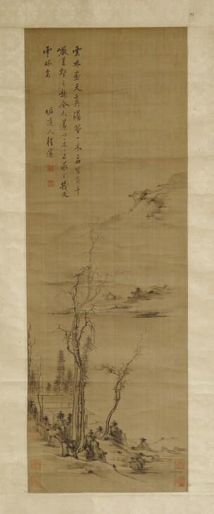 此山水画轴,绢本,设色,31.7×90.5厘米,左上角有一题款:“云林画天真淡菪[dàng]一木一石自有千言万壑之趣今人遂以一木一石求之几失云林矣”,落款为“垢道人程邃[suì]”。并钤[qián]有朱印两方。 艺术造诣
