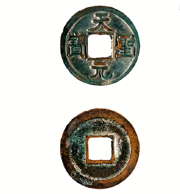 天圣元宝[a]铸造于北宋宋仁宗赵祯[2][2]天圣年间(1023~1032),有青铜、铁两种材质[1],铜钱为小平版式,铁钱为小平、折二版式[3]。 天圣元宝铜钱,一般直径为2.33~2.7厘米,重2.7~5.4克。面文“天圣元宝”,旋读。楷、篆两种书体,其直径轮廓也完全相同,可组成对钱[4]。有广穿、狭穿、隐起文、正郭、广郭、隐郭、细郭、长孔、阔天、昂宝等版别[1]。