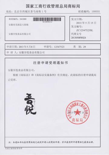 经营范围:蔬菜制品【蔬菜干制品(热风干燥蔬菜)、食用菌制品(干制食用菌)】、水果制品【水果干制品(分装)】、代用茶(分装)加工(以上生产许可证期限至2016年7月1日止)、销售;食用菌产品、菌种、蔬菜培育、粗加工、销售及原辅材料供应;食用菌生产技术咨询、培训、服务及新品种推广;毛茶、农副产品销售。 2014年7月安徽吾悦食品有限公司获得科技型中小企业技术创新基金立项证书。