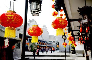 “剑南老街”位于四川省绵竹市,总长500米,完全按照明清风格设计。沿“街”前行,一边贯穿起“天益老号”酒坊、古窖池群等“剑南春”独有的御酒历史;一边贯穿起川酒会馆、历代酒肆、关帝庙、古戏台、年画坊等美酒文化。丰富的历史文化资源景点沿老街两边分布,仿古建筑墙体上线条流畅的年画,叙述着绵竹酒文化与 年画文化同生共长的历史渊源;三国文化中的“桃园三结义”、“温酒斩华雄”等历史场景,则生动演绎着中国酒文化的独特魅力。 曾经的繁华已成往事,今日剑南春人决定以“走向历史、开创未来”的智慧和情怀,重现盛世唐朝的景象,挖掘宫廷御酒的独特文化,将唐时宫廷酒的文化意蕴传承延续到现代名镇文化当中,让历史“活”起来。