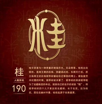 关于桂姓的来源主要有两种,一种说法是桂姓源于姬姓,为周王胄后裔。据《桂氏家乘序》记载,周王的后裔季桢[zhēn]曾经任过秦国的博士。秦始皇焚书坑儒的时候,姬季桢被杀害了。姬季的弟弟季桂为了逃避株连的命运,就按自己名字的读音将姬季桢的四个儿子更改姓名。老大叫桂奕,居住在幽州守坟墓;老二叫昋突,迁居济南朱虚;老三叫炅奖,居住于齐国历山;老四叫炔奘,移居河南阳城;于是有了桂、昋、炅、炔四个同音的姓,桂姓就是老大桂奕的后代。[1]另一种说法是桂姓源于地名,出自西汉时期桂林郡,属于以地名为氏。[3] 桂姓早期活动在陕西、河南,后来向甘肃发展,并在天水郡(今甘肃通渭县)形成郡望;宋代以后,除了在山东分布外,桂姓在四川、浙江、湖南、江西、安徽都有一定分布;当今桂姓多分布于湖北、河南、江西、浙江、安徽、陕西、重庆的部分地区。[6] 姓氏源流