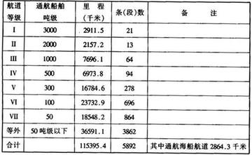 根据《内河通航标准》(GB50139-2014),中国内河航道按等级和通航的船型条件分为七级:一级航道(可通航3000吨);二级航道(可通航2000t级船舶);三级航道(可通航1000t级船舶);四级航道(可通航500t级船舶);五级航道(可通航300t级船舶);六级航道(可通航100t级船舶);七级航道(可通航50吨)。[1]其中,三级航道尺度的最低标准为水深3.2m、底宽45m。根据《内河通航标准》(GB50139-2014),新建的桥梁采用一跨过河,桥梁净空高度不小于7m。四级航道尺度的最低标准为水深2.5米、底宽40米[1] 《内河通航标准》适用于天然河流、渠化河流、湖泊、水库、运河和渠道等通航内河船舶的航道、船闸和过河建筑物的规划、设计和通航论证。内河航道通航海轮河段的规划和设计,除应符合《内河通航标准》的有关规定外,桥梁的通航净空尺度尚应符合国家现行标准《通航海轮桥梁通航标准 》(JTJ311)的有关规定。[4]